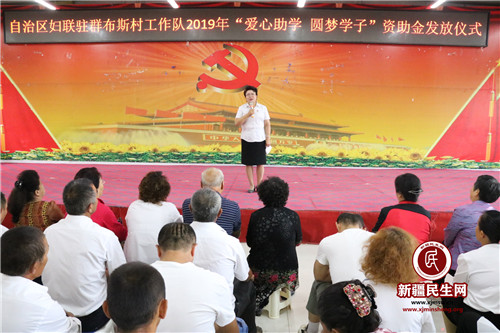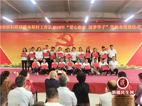 新疆民生网(毕春晖)百年大计,教育为本。为减轻群布斯村困难学生家庭的经济负担,激励更多家庭重视教育,鼓励更多学生努力学习,2019年9月2日,自治区妇联驻群布斯村“访惠聚”工作队利用周一升国旗“三结合”活动时机,组织开展2019年“爱心助学·圆梦学子”助学金发放仪式,为村今年新考入大学的32名学生发放助学金39700元,鼓励他们以感恩之心积极生活,刻苦学习,成为对社会有用的优秀人才,共同为实现新疆社会稳定和长治久安贡献青春和力量。
